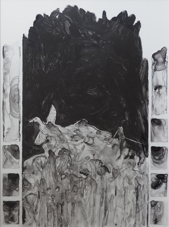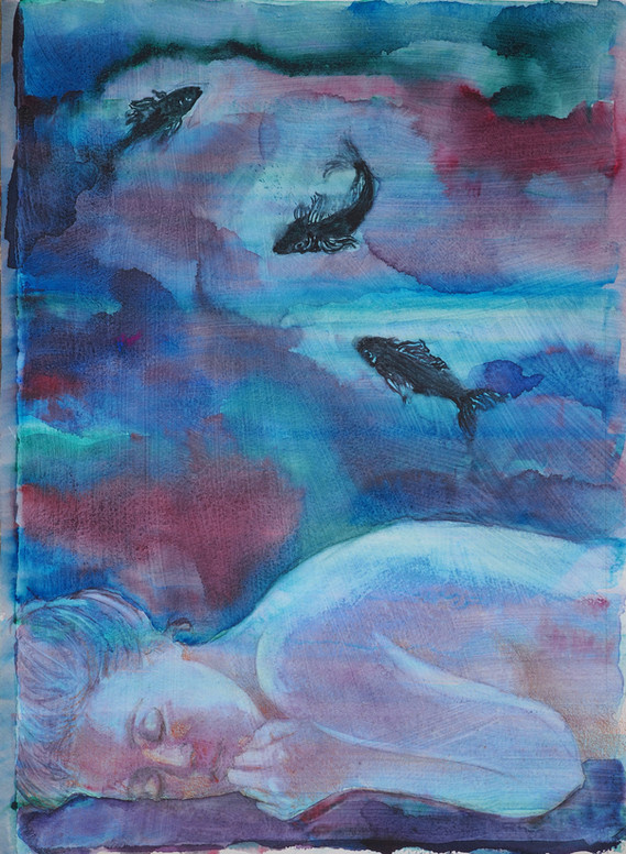 My works continue the tribute in my aesthetic to dreams, mysterious promptings from the muse, and the unexpected compositional structures and imagery which emerge of their own volition when very watery washes have been employed. Renderings of improbable land and waterscapes, symbols, architecture, patterns and figures (human and animal) reveal themselves. I am always intrigued and delighted by the way imagery appears and is adamant about what must and must not be added to complete the work. Any initial ideas I might have had are always changed by its demands. Completing the piece is like working my way through to the end of a particularly satisfying mystery novel; the intricate dance between imagery and the consideration of formal needs keeps me looking at and working on it until the inevitable solution arrives.